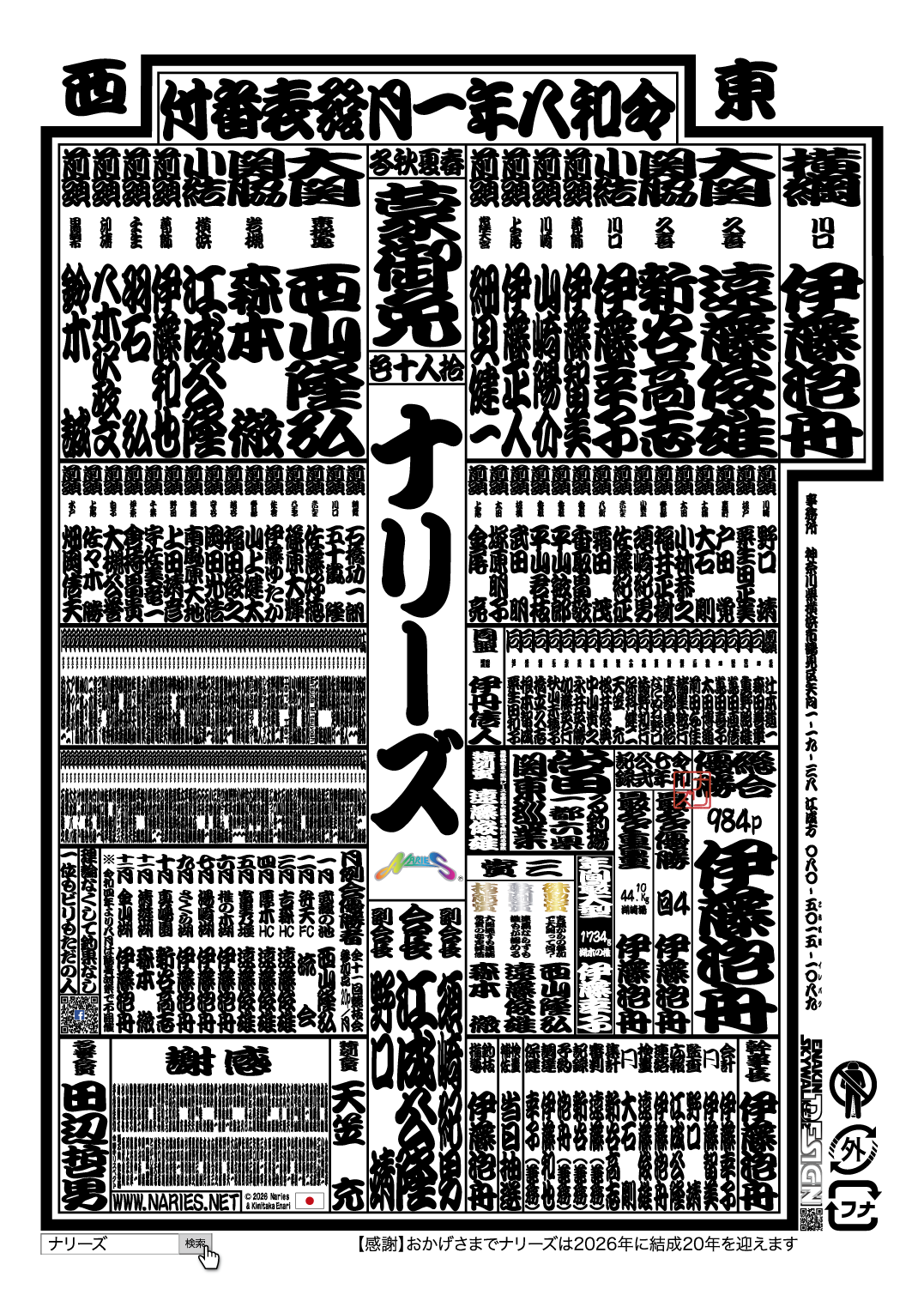 ナリーズは、最近では珍しくなった釣番付を発行しているクラブ(釣り会)です。もちろん、手書きではなくパソコン利用のものですが、相撲番付のように虫眼鏡が必要な釣番付を自負。且つアシンメトリー&CMYK4版。毎年少しずつ進化(R4以降はレイアウト調整と「發」)する番付は、すべてをダウンロード可能です。